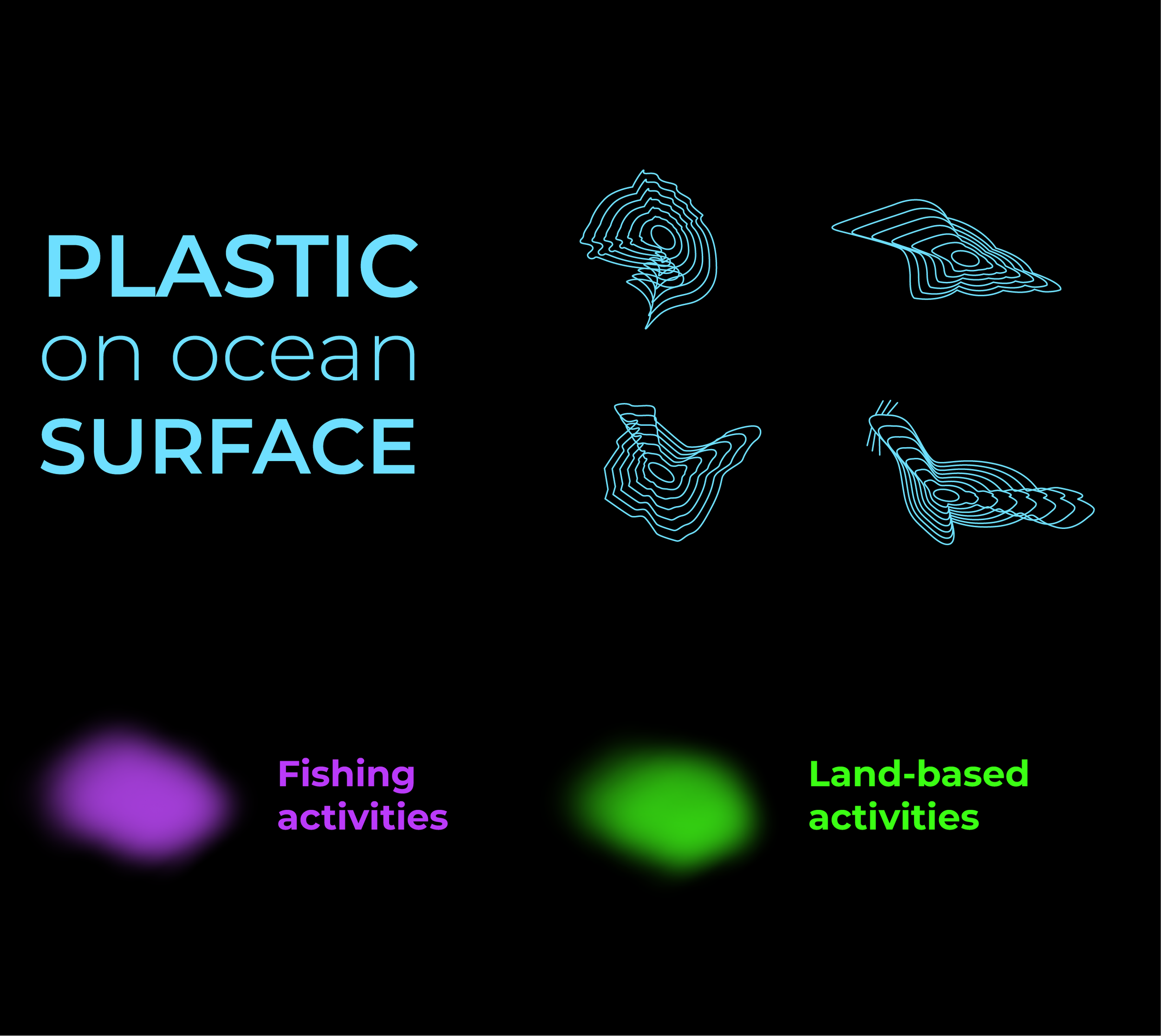 I use worldwide latitude shape to visualized data. The blue lines show the location of the plastic pollution, almost all of them on the ocean surface. In order to better match the theme, I designed the blue line into the shape of marine life. Based on the location, I use purple and green to represent the reason of this pollution. Purple means plastic from fishing activities, green means plastic from Land-based activities.